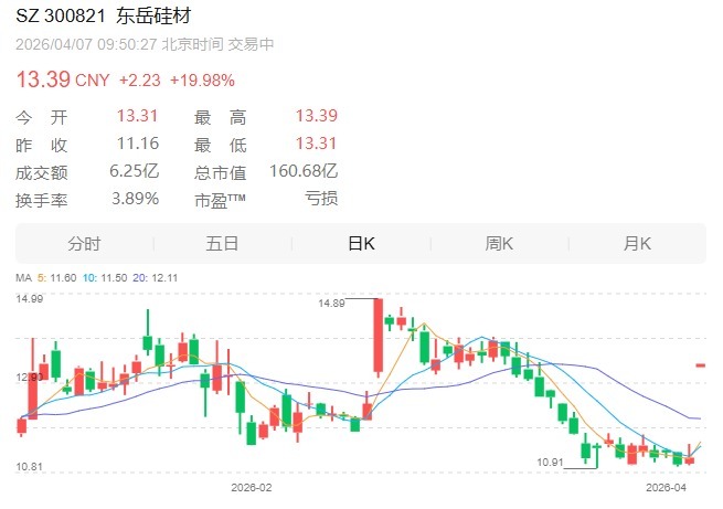 东岳硅材开盘19.98%涨停,4月3日晚间,东岳硅材发布公告称,预计2026年一季度归属于上市公司股东的净利润盈利1.83亿元~2.03亿元,同比增长397.02%~451.34%。自2025年12月份以来,受市场环境及行业供需格局改善影响,有机硅行业主要产品价格上涨并回归合理区间,公司产品毛利率显著提升。