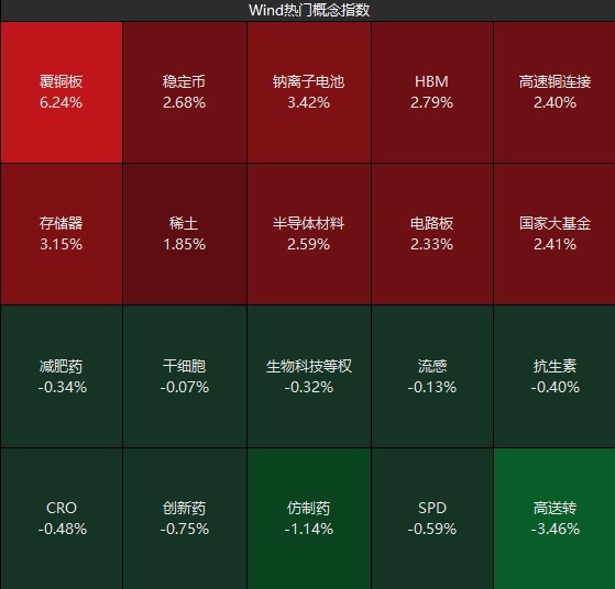 覆铜板、存储器、高速铜连接、钠离子电池、电路板、先进封装、化工、电子元器件等概念涨幅居前;能源设备、石油天然气、制药、农业、煤炭、贵金属等概念跌幅居前。